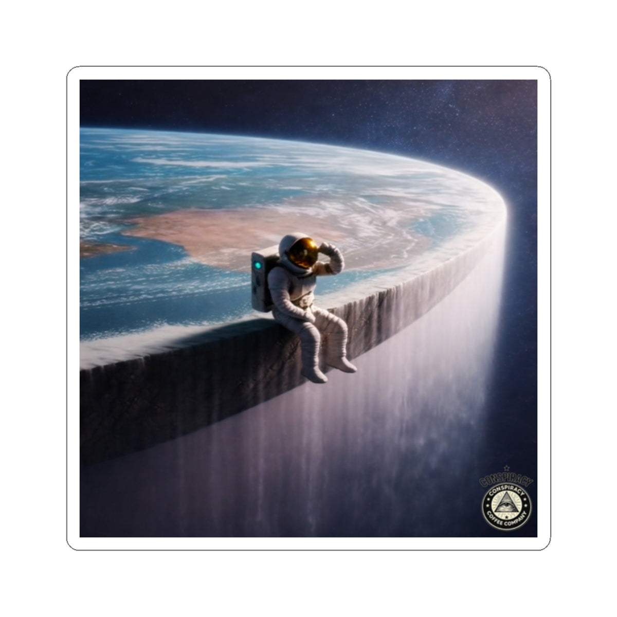 The Edge of the Earth sticker captures a quiet moment at the boundary—where curiosity meets doubt and observation replaces assumption. Inspired by classic conspiracy imagery and modern existential humor, it’s a subtle signal to anyone paying attention.